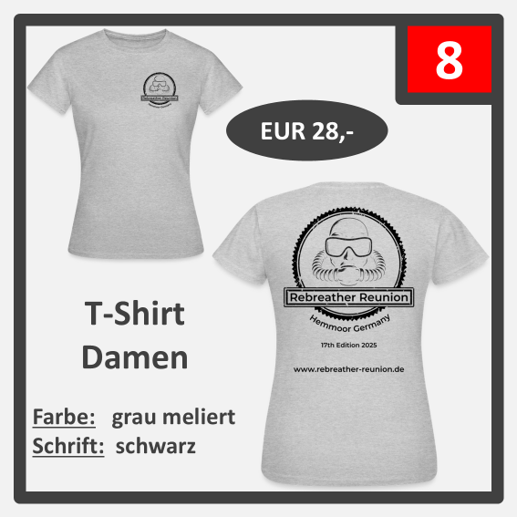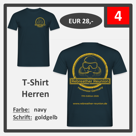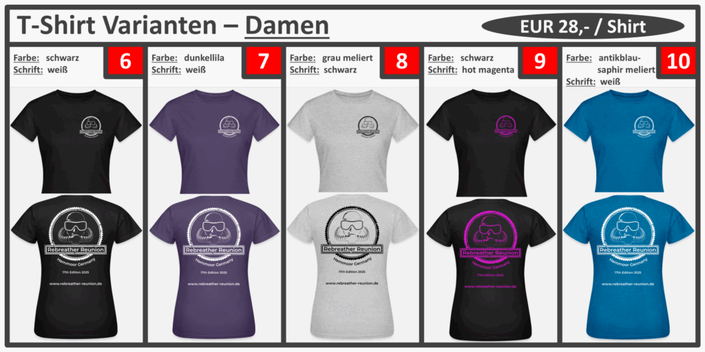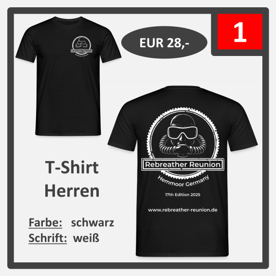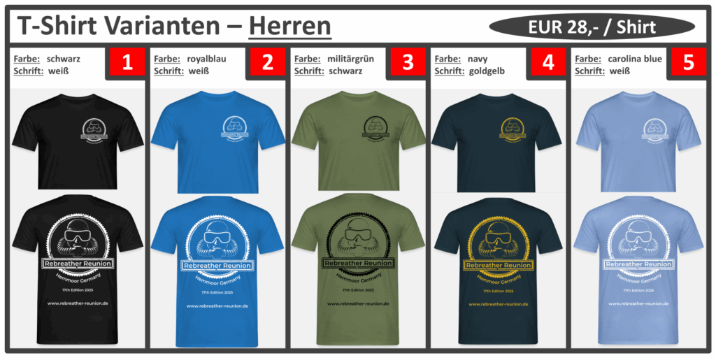 ab sofort könnt Ihr Editions-Shirts der diesjährigen Rebreather Reunion bestellen. Es hat ein paar Tage länger gedauert, da wir unser Logo gewechselt haben. Wir hoffen, das neue und frische Design gefällt Euch genauso gut wie uns.